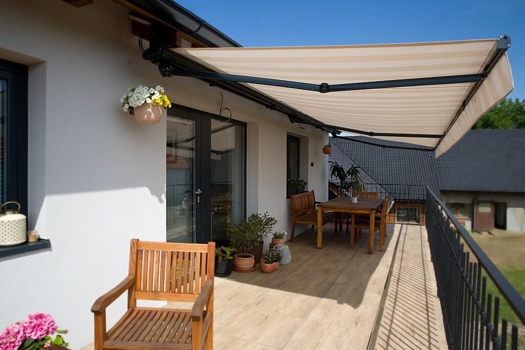 Vybrali jsme si markýzu s nosným profilem Stela. Je 7 metrů dlouhá a má možnost 2,5 metru výsuvu. Ukotvená je do krovu a její montáž jsme zvládli sami. Respektive skrz její délku nás na to muselo být 5 + moje maličkost, která vše dokumentovala a hlídala. 😀