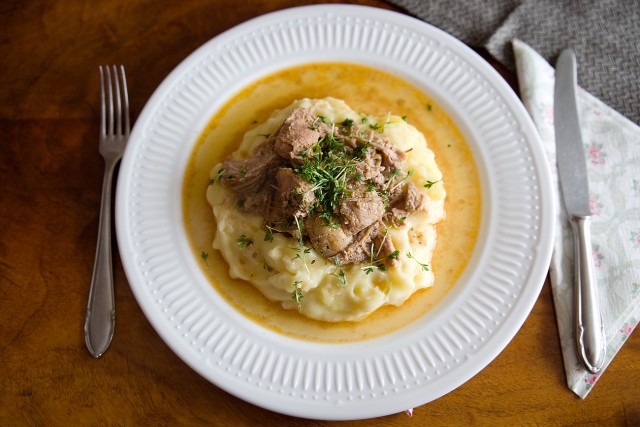 Trhané vepřové maso s kaší z brambor a krup