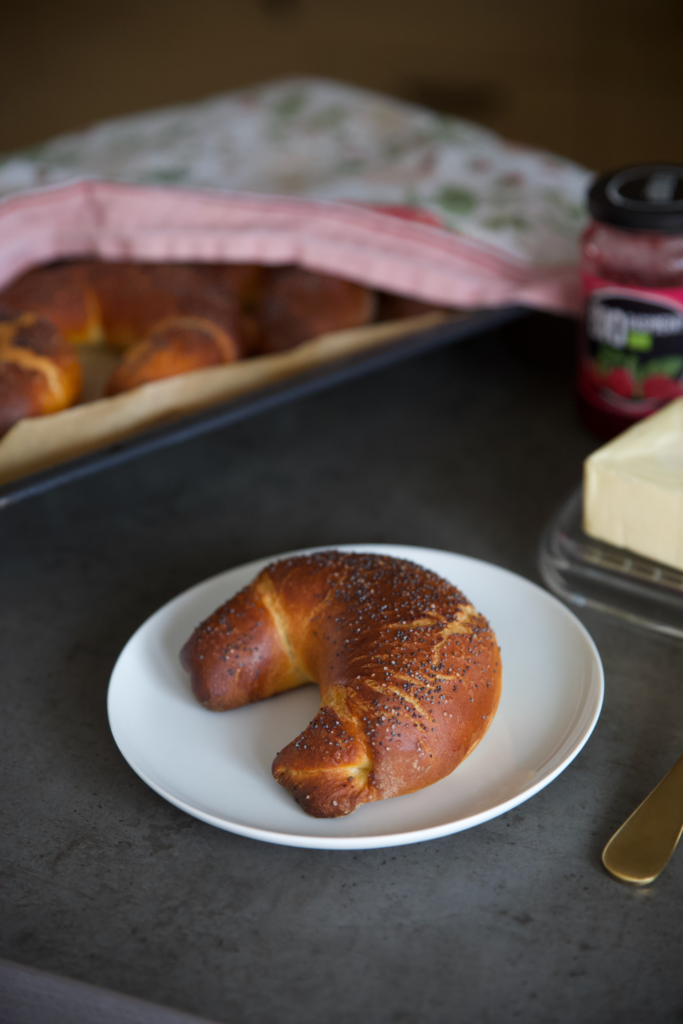 Po upečení je přendáme na mřížku a přikryjeme vlhkou utěrkou, díky tomu zůstanou krásně měkké.